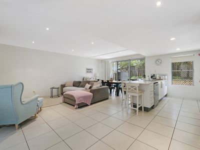 Downstairs is air conditioned, fully tiled and has a lovely open plan design which opens onto a private tiled courtyard with small garden. The oversized kitchen is modern, functional and features stone bench tops, stainless steel appliances and gas cooking.